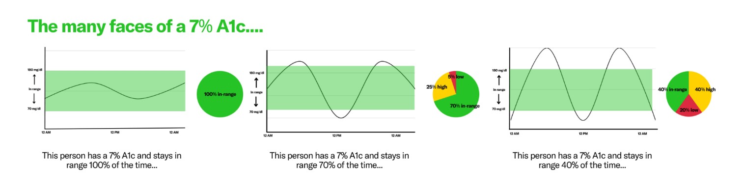 Patients aim to keep glucose within target range. More time outside the range means higher complication risk. HbA1c is the most common measure, but it only reflects average control and can mask dangerous fluctuations (see graphic).4