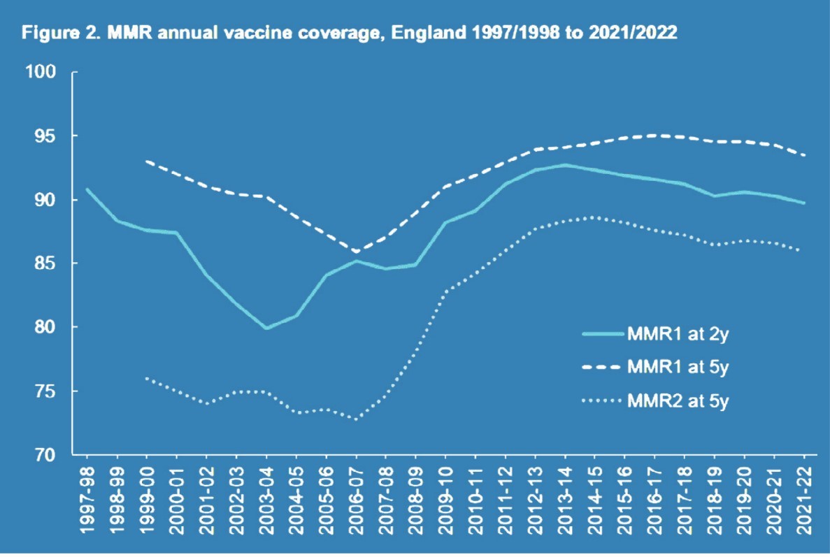 Rates of vaccination required to achieve herd immunity for measles are exceptionally high, likely around 95% due to the highly contagious nature of the disease. A report from the UK government highlights the increasing risk of a resurgence of the disease associated with low vaccine uptake. The risk is greater in areas with lower uptake. In the UK context, uptake in London is unusually low: only 74% of children have received the recommended two doses of MMR by age 5.2