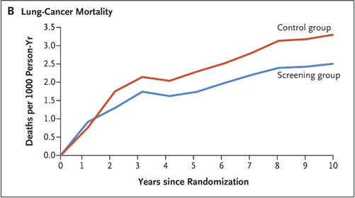 However, several other studies emerged within a few years, all suggesting the same thing. Data came from the United States, Italy, Germany, South Korea and more, with consistent results. In isolation, each trial implied a modest benefit but didn’t have enough data to confidently prove it. However, a meta-analysis of nine of these studies suggested more convincing benefits, estimating a 16% reduction in lung-cancer mortality which did reach clear statistical significance, and a 3% reduction in all-cause mortality which was also (just!) significant.[2]