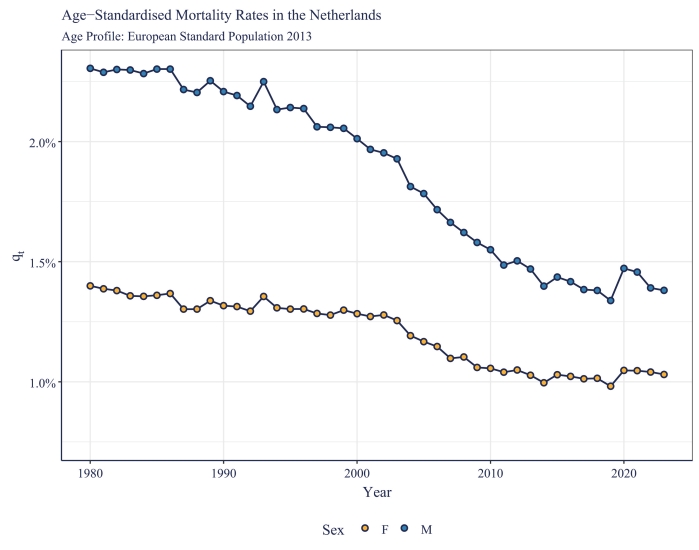 For years, age-standardised mortality rates in the Netherlands have shown steady improvements. However, the excess deaths since 2020 mean that there is now a break in the pattern of these improvements. The question we’re therefore faced with is how to manage this when considering future mortality forecasts.