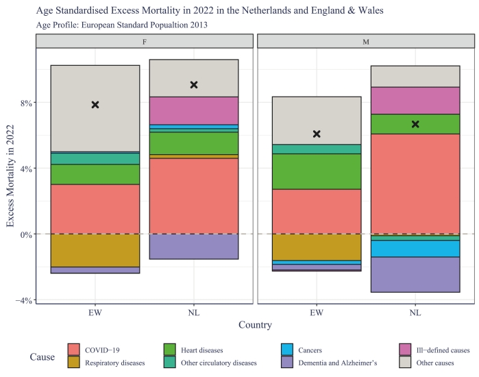 One way to better understand the drivers of excess mortality is to compare the experience of different countries. The Netherlands and England & Wales might be expected to have similar drivers of mortality, and while this is true in aggregate (shown as crosses in the graph [below]), the drivers by cause look to be very different.