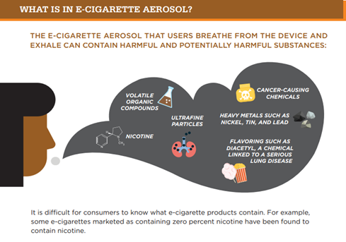 E-cigarette vapour might not contain tobacco, but they potentially expose users to a variety of other chemicals, which may prove harmful. Whilst e-liquid is mostly comprised of humectants, solvents, flavourings and colourings that are approved for use in food, vaporising the liquid may create altered chemicals that have never been tested for inhalation safety. Examples of this include propylene glycol which may cause asthma when vaporised, and relatively common ingredients such as the sweetener sucralose and flavourings like vanilla bean extract and cinnamon which may break down into toxic or cancer-causing chemicals when subjected to high temperatures.[5] The metal coils which create the aerosol may impart toxic metals and small, ultrafine particles to the vapour as they degrade, whilst the traces of a chemical used in pesticides and disinfectants have been found in some vape liquids which may result in cyanide formation after heating. Counterfeit vape liquids may be laced with additives to decrease production cost.